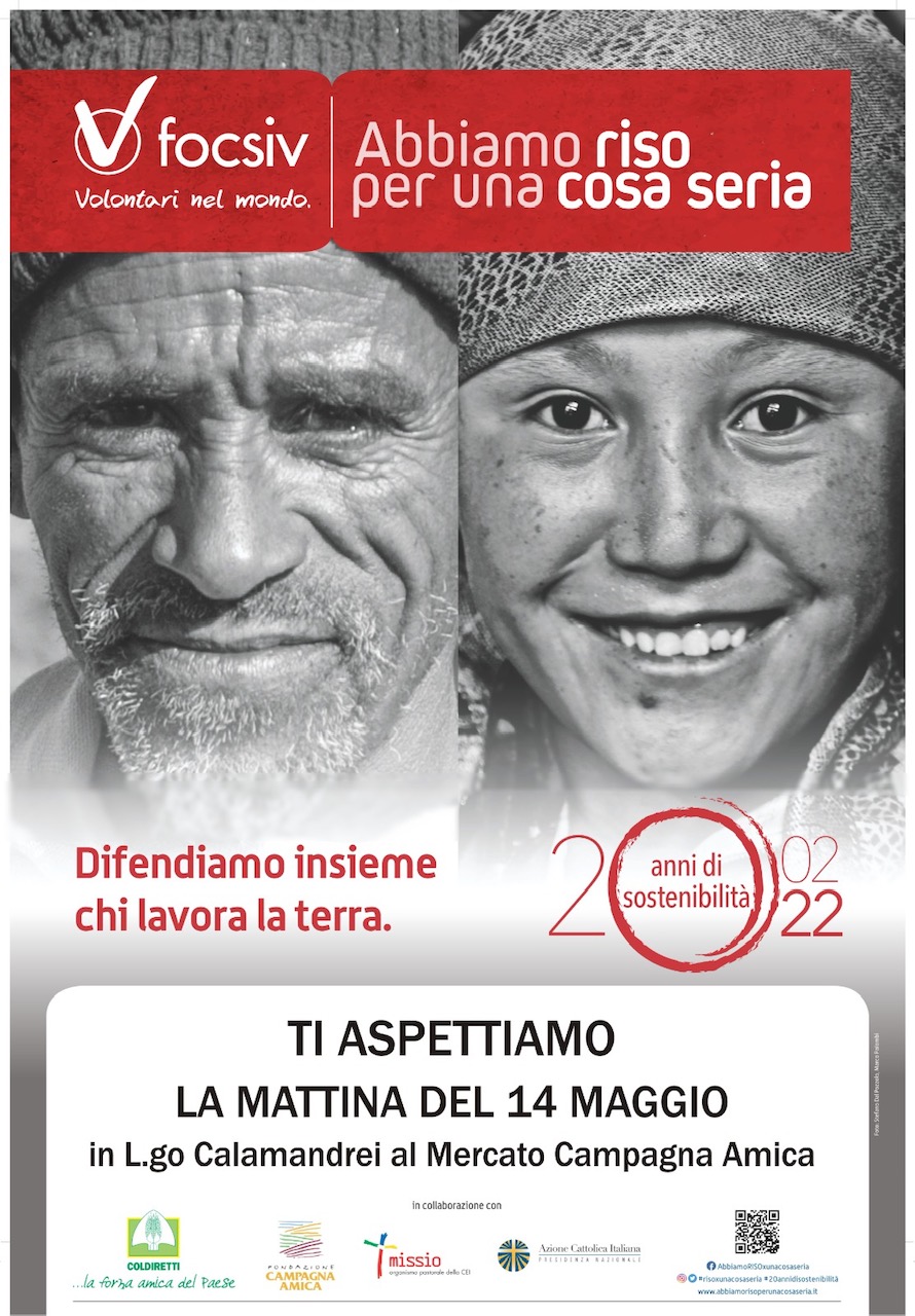 Torna la Campagna "Abbiamo riso per una cosa seria" a favore dell'agricoltura familiare in Italia e nei paesi poveri, promossa da FOCSIV – Volontari nel Mondo, insieme a Comivis (Comunità Missionaria di Villaregia per lo Sviluppo), Coldiretti e Campagna Amica, per portare nelle piazze italiane il tradizionale pacco di riso 100% italiano, prodotto dagli agricoltori di Coldiretti aderenti alla Filiera Agricola Italiana.