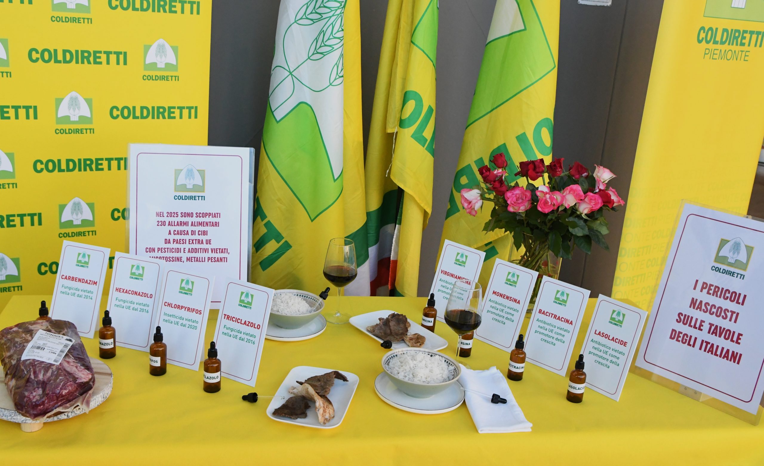 Per l’occasione è stata allestita una tavola che ha messo a confronto alcune eccellenze made in Italy, dal riso Carnaroli alla carne di razza piemontese, con prodotti stranieri che entrano in Europa senza adeguati controlli e spesso trattati con sostanze vietate nell’Ue.