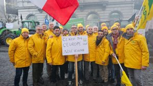 Su un grande striscione si legge “Stop alle follie dell’Europa” ma gli agricoltori esibiscono anche cartelli con “Basta terreni incolti!”, “Scendete dal pero”, “Stop import sleale”, “Prezzi giusti per gli agricoltori”, “No Farmers no Food”, “Cibo sintetico, i cittadini europei non sono cavie”, “Mungiamo le mucche non gli allevatori”. “Non è l’Europa che vogliamo” si legge nei documenti di mobilitazione in mano al Presidente della Coldiretti Ettore Prandini accanto al tavolo allestito per far vedere le follie dell’Europa a tavola.